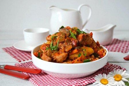 Tu auras besoin de: 300 ml d'eau, 0,5 kg de filet de bœuf, 2 oignons, 3 cornichons, 2 aubergines, 1 poivron, 3 gousses d'ail, 5 petits pois noirs et piment de la Jamaïque, 150 ml de jus de tomate, sel.