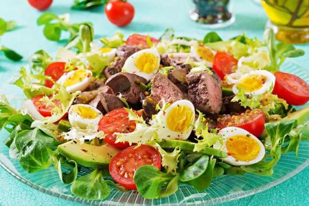 Tu auras besoin de: 1 blanc de poulet, 1 bouquet de salade verte et basilic, 100 g d'oignon rouge, un demi citron, 1 avocat, 3 tomates, 150 g de mozzarella, 50 g de bacon, huile d'olive, amandes, sel, épices, vinaigre balsamique.
