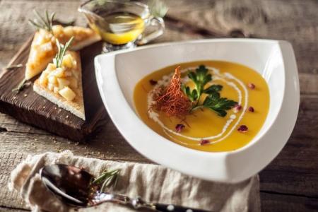 Préparation: Hacher les oignons rouges avec l'ail et les faire frire dans du beurre, ajouter la citrouille en petits cubes et cuire jusqu'à ce qu'ils soient tendres. Pour la saveur, vous pouvez ajouter et évaporer 50 ml de cognac ou de rhum. Ajouter le bouillon et les épices, faire bouillir pendant 7 minutes et battre avec un mélangeur. Garnir la soupe d'herbes et de graines de citrouille.