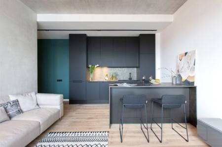 Dans les cuisines combinées et les studios, les canapés d'angle sont parfaits pour le zonage. Surtout dans une disposition en îlot, lorsque les meubles ne sont pas placés le long des murs, mais dans des zones fonctionnelles.