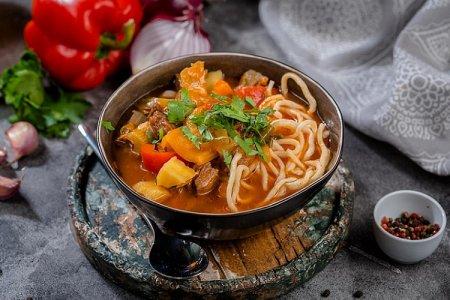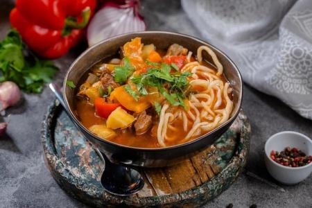 Tu auras besoin de: 4 verres d'eau, 500 g de bœuf, 1 gousse de piment fort, 2 pommes de terre, 1 oignon, 1 carotte, 1 poivron, 2 tomates, 1 c. concentré de tomate, 3 cuillères à soupe huile végétale, 100 g de nouilles, 0,5 c. cumin, 0,5 c. poivre noir moulu, 15 g de sel, herbes au goût.