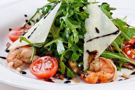 Vous avez besoin: 10 crevettes décortiquées, un demi-bouquet de roquette, 2 feuilles de laitue, 1 tomate, une poignée d'olives noires, 80 g de parmesan, 2 gousses d'ail, sel, poivre noir moulu, 3 c. huile d'olive, 50 g de beurre.