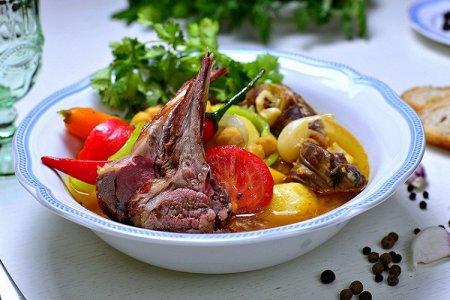 Préparation: Faire tremper les pois chiches pendant 2 heures. Faire revenir l'agneau à feu vif avec les oignons et les épices. Verser l'eau chaude, ajouter les pois chiches, le jus de tomate et cuire 50 minutes. Verser les pommes de terre hachées, les poivrons, les tomates et les carottes. Au bout de 5 minutes, ajoutez le chou haché. À la fin, saupoudrer d'herbes et éteindre.