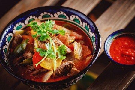 Préparation: Couper la viande en morceaux moyens et faire frire jusqu'à ce qu'elle soit dorée. Ajouter les oignons hachés, les carottes et le ragoût pendant encore 5 minutes. Ajouter les épices, les tomates concassées, les piments forts et verser de l'eau chaude sur le tout. Faire bouillir le shurpa pendant une heure à feu doux, à la fin du sel et saupoudrer d'herbes hachées.