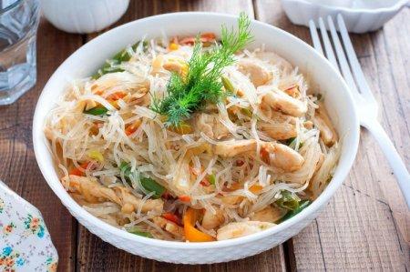 Tu auras besoin de: 250 g de poulet, un demi oignon rouge, 1 carotte, 300 g de poivron, 100 g de fromage, 100 g de nouilles.